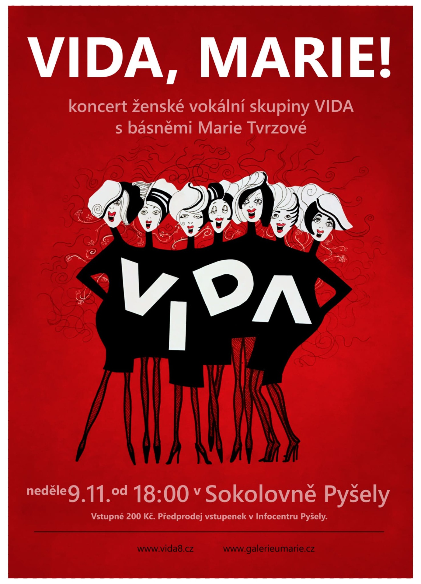 Srdečně Vás zveme na koncert Vida, Marie! – večer plný rockových a popových hitů v originálních aranžích pro osm hlasů, doplněný autorskou poezií naší milé přítelkyně, výtvarnice a umělkyně Marie Tvrzové.